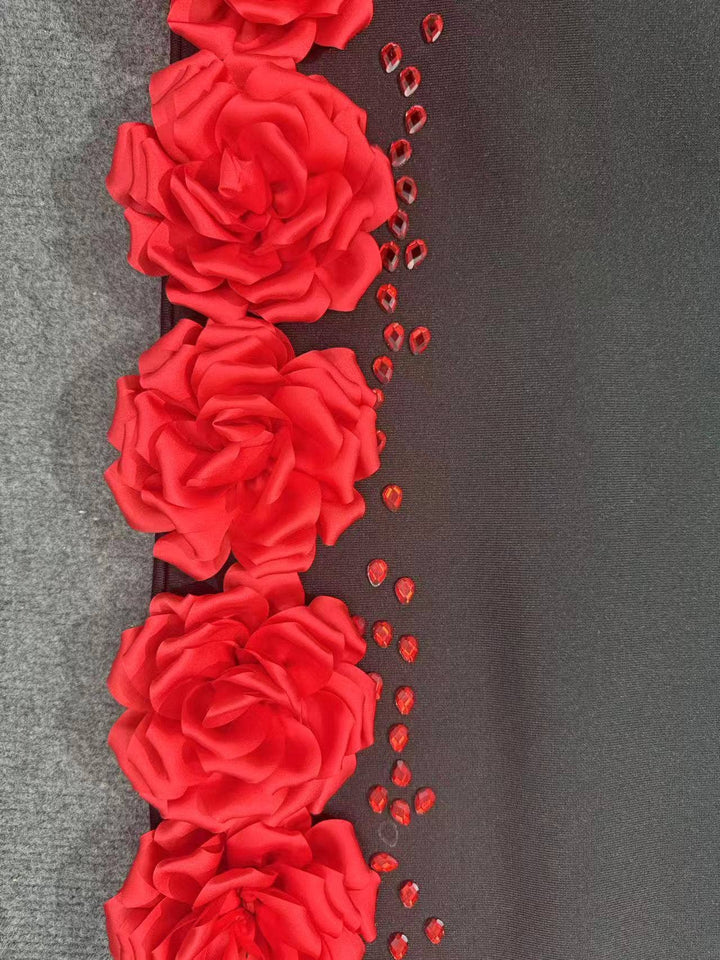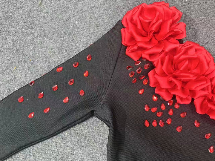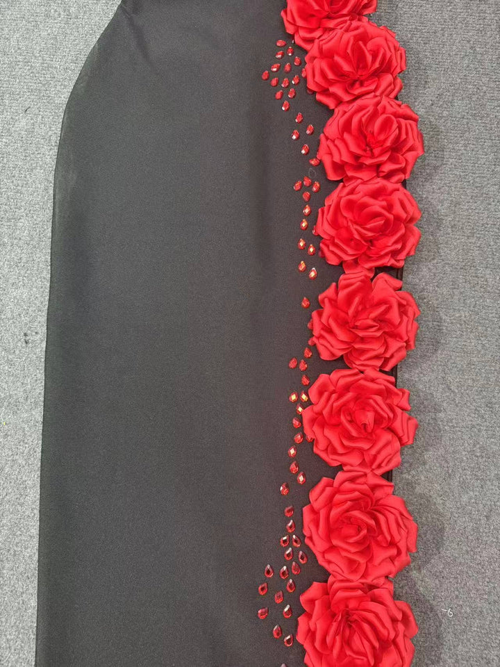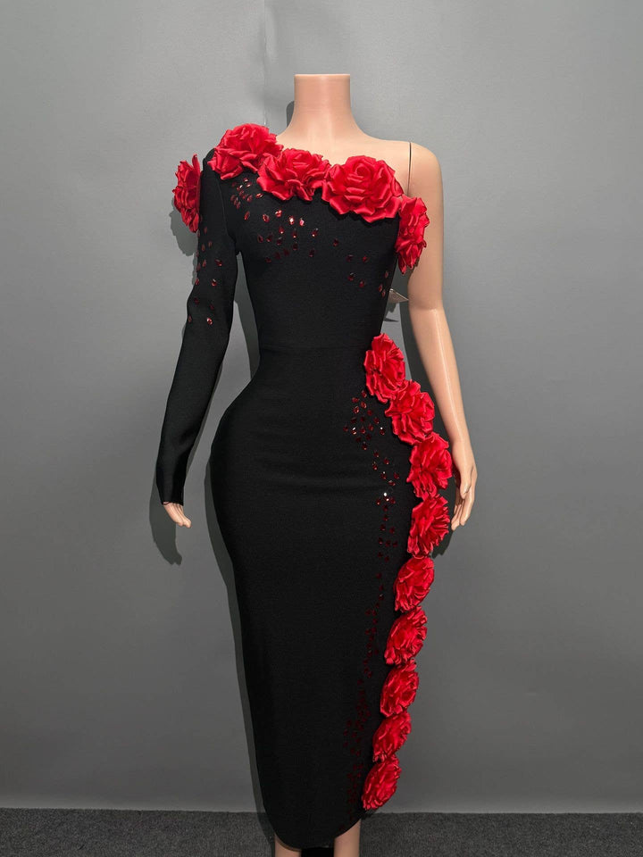 Command attention in this high-end evening gown featuring a sculpted one-shoulder silhouette adorned with vibrant red 3D flowers and sparkling crystal accents. The sleek black bandage design flatters the figure, while the floral embellishments cascade from the neckline to the skirt with dramatic elegance. A refined blend of structure and softness, this floor-length dress is the perfect fusion of glamour and artistry—ideal for upscale dinners, formal galas, or red carpet events. Designed to captivate, it delivers both luxurious comfort and striking visual impact.
