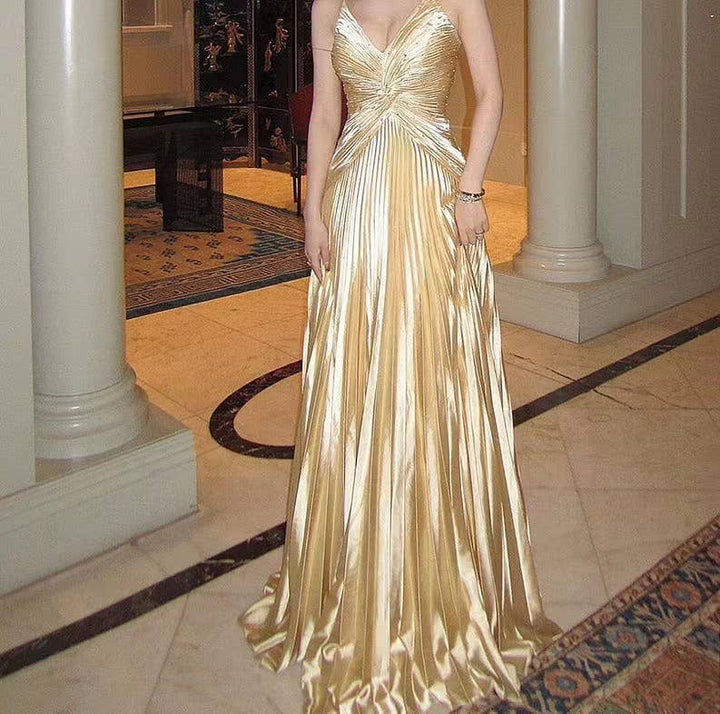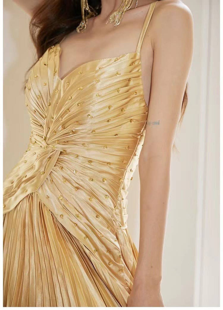 Unveil sophistication with this stunning gold suspender dress, perfect for weddings or upscale events. Crafted for the high-grade lady, this slim-fit gown boasts a holiday style that’s both sexy and elegant. The backless design adds a touch of allure, while the long flowy skirt promises graceful movement. Ideal as a bridal or bridesmaid dress, it exudes luxury with every detail.