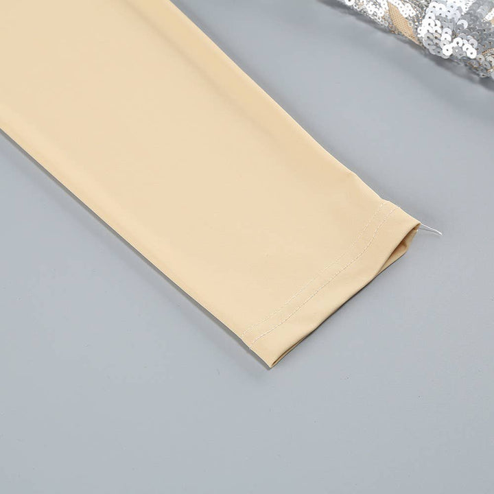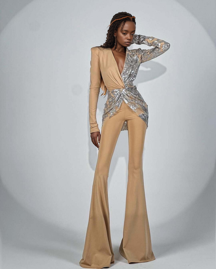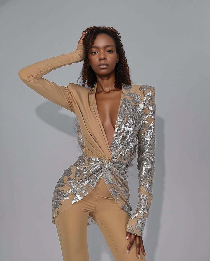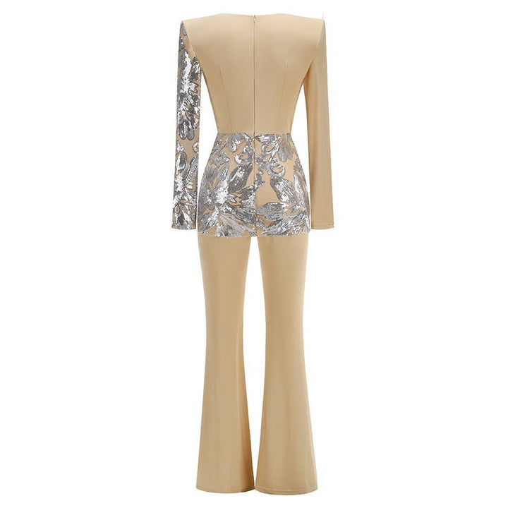 This striking evening jumpsuit blends elegance with bold style, featuring a deep V neckline that enhances the silhouette with refined allure. Crafted with shimmering sequins, it radiates glamour, making it perfect for parties and special occasions. The long sleeves flow gracefully with a flared design, adding a touch of drama and sophistication. Tailored for a slim fit, it accentuates curves while maintaining comfort and flexibility. The sleek structure elongates the body, creating a statuesque effect, while the intricate stitching ensures durability and high-quality craftsmanship. Designed for those who love a daring yet elegant statement, this jumpsuit is an eye-catching choice for evening celebrations.